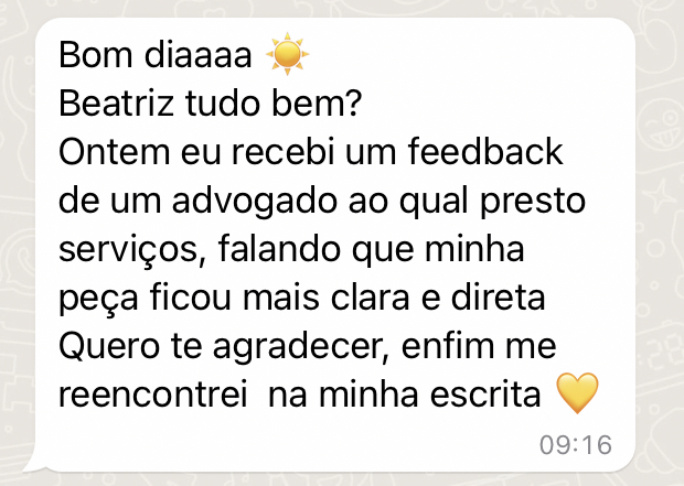 Durante a jornada, ela contou com a ajuda de um amigo mais experiente, que lhe mostrou o caminho para aumentar as chances de êxito no processo por meio da escrita. E ela constatou: o advogado que escreve bem, de forma clara, impactante e persuasiva, cresce em qualquer área; ganha reconhecimento e destaque profissional.